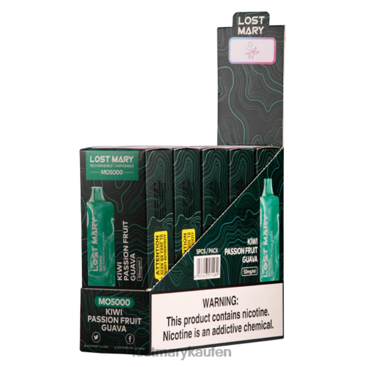 Geschmack: Der wiederaufladbare Kiwi Fuse Lost Mary Mo5000 (früher bekannt als Kiwi Passion Fruit Guave) verwendet eine tropische Mischung aus Kiwi-, Passionsfrucht- und Guavenaromen.