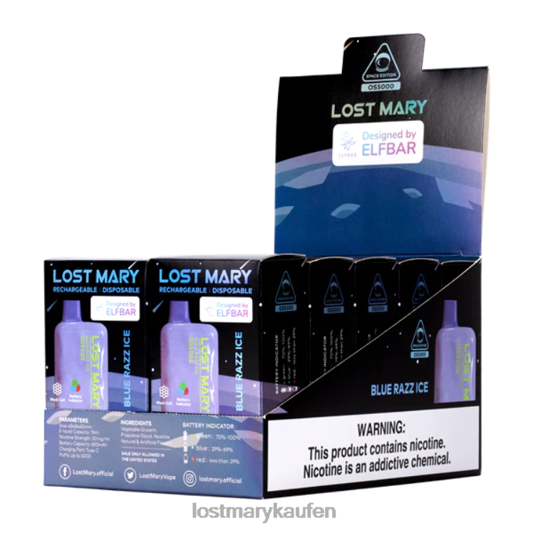 Geschmack: Das Blue Razz Ice Lost Mary OS5000 mischt einen von Süßigkeiten inspirierten blauen Razz mit einem kühlen Menthol beim Ausatmen.